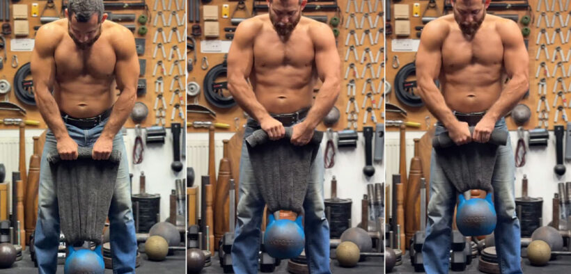 “You don’t need fancy equipment,” explained Strauss. “Here’s a makeshift wrist roller using just a weight and a towel, and it absolutely fries the forearms,” While the coach used a kettlebell, you could substitute this with any load that can move up and down in a straight line and has an anchor for the towel, such as a dumbbell. To get started, Strauss inserts the towel into the hole of the kettle bell until it reaches the halfway point. He then takes the two ends and puts them together, gripping them at the top. To begin his first rep, Strauss rolls the top ends of the towel while keeping his hands at the same level, so that as he rolls the towel toward him with his wrists, the weight begins to lift. When you can no longer roll the towel towards you, go in the opposite direction and let the weight descent back towards the ground in order to complete the rep.